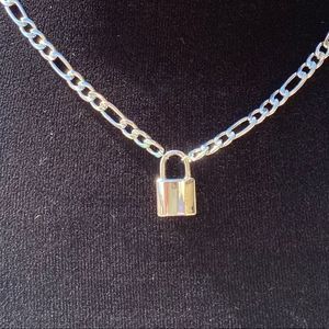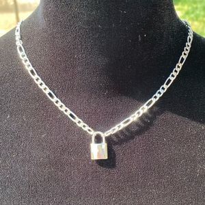 Silver tone chain necklace with lock pendant.