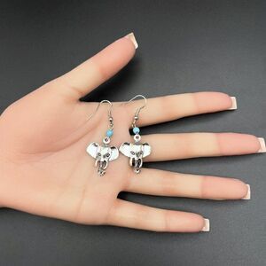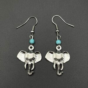 Silver Lucky Elephant and Blue Turquoise Beaded Boho Dangling Drop Hook Earrings