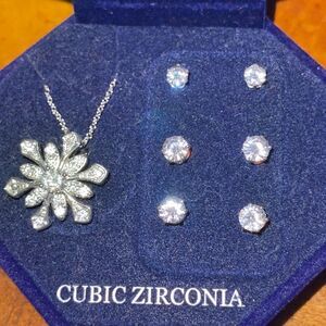 Silver Plate Cubic Zirconia Snow flake Necklace and Stud Earring Set