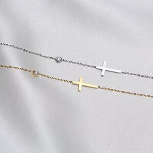 This gorgeous sterling silver necklace features a sideways cross pendant with a cubic zirconia bezel charm. It measures 15.7 inches long with a 2-inch adjuster. A cute heart charm adorns the back of the adjustable chain. Delicate and classy, you can wear this necklace alone or layer it with your favorite chains. See my other listings for the gold version.