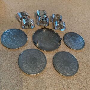SilverSmith Silver Plated Coasters And Napkin Rings Set. They appear to have letter H engraved on them. Coasters are tarnished and 2 are missing. Napkin rings have very little tarnish.