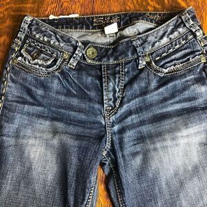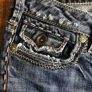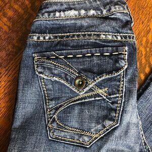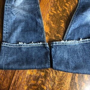 Very cute jeans with fun stitching and flaps on pockets. There is some distressing at hem and front pockets. I’m thinking from wear rather than from factory. In excellent condition.