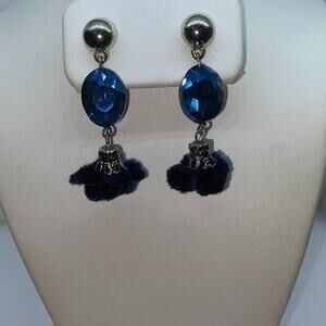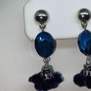 Silver-Tone Blue Beaded & Pom-Pom Dangle Earrings