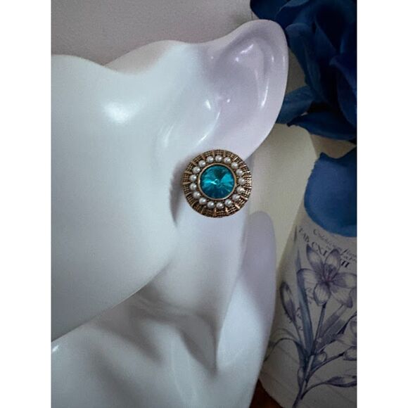 Silver-Tone Blue Rhinestones Faux Pearl Stud Earrings NWOT 1.3/4"