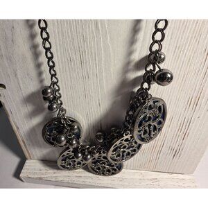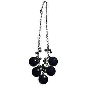 This necklace features a silver-tone chain adorned with blue faceted pendants and polished ball accents, offering a bold and elegant accessory.