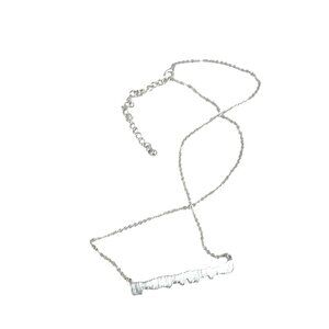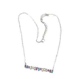This exquisitely designed silver-tone necklace features a sleek and delicate chain, adorned with vibrant multi-colored gemstones that catch the light beautifully. The centerpiece is an abstract bar pendant with intricate texture, offering a perfect blend of contemporary style and artistic appeal. Adjustable and lightweight, it’s ideal for those seeking a chic yet understated accessory.