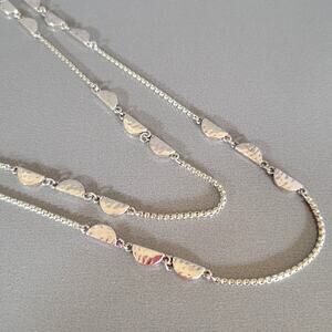 Elegant silver-tone double strand necklace with metal accents. Measures 18 inches with a 3-inch extender for adjustable length. Perfect for layering or wearing alone. Packaged and shipped carefully from a smoke-free environment. Check my Feedback and other listings.