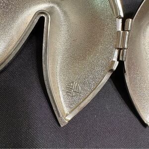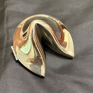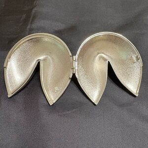 silver fortune cookie-shaped trinket box or ring box. Perfect for an engagement ring, proposal, pregnancy announcement to grandparents, big enough to fold a scan photo in . Has the Shou symbol inside meaning longevity to convey a blessing for a long life. It’s possibly silver plate but there is no makers mark. In great condition