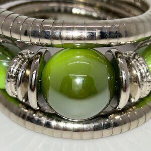 Silver-Tone & Green Acrylic Bead Memory Wire Bracelet Adjustable Wrap Style