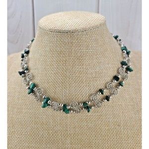 Silver-Tone Necklace Choker Malachite Gemstone Bead Chip 14.5" Length