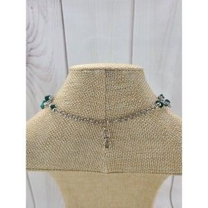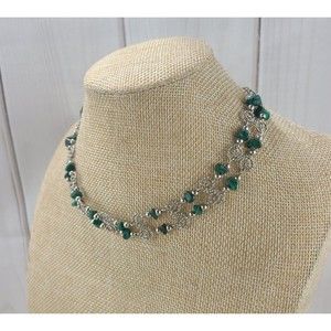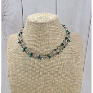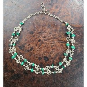 Silver-Tone Necklace Choker Malachite Gemstone Bead Chip In nice pre-owned condition. Vibrant color. Total of 14.5" in length, but when clasped sits high close to the neck, sold as seen in the pics
