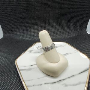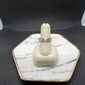 Silver colored ring band with a wave pattern on it. Sizes measured on a sizing stick.