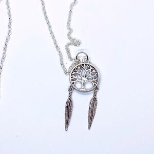 Silver-tone chain & pendant. Tree of Life symbol with 2 feathers hanging down. Lobster clasp closure – Dangle style earrings.