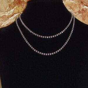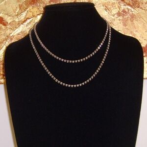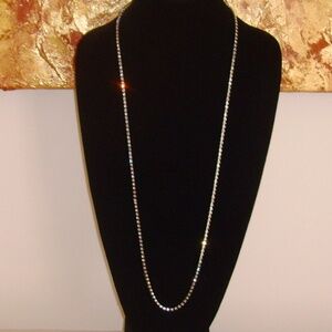 This Silver-Tone and Clear Rhinestone Single Strand Necklace measures 36 inches in length and slips overhead. It is in very good vintage condition, but there is one replacement rhinestone. Please see last pic. This will not at all be seen when worn, as I had to take a magnifying glass to find the replacement stone.