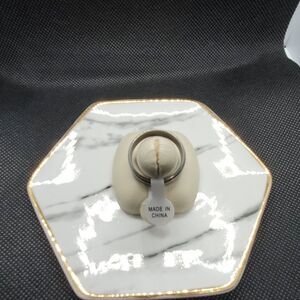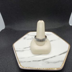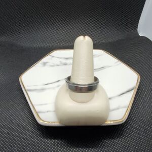 Silver colored ring band with flame pattern on it. Sizes measured on sizing stick.