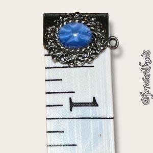 This elegant pendant features a silver-tone metal frame surrounding a striking blue cabochon sapphire glass centerpiece. Measuring approximately 3/4” x 1/2” in length, it is a compact yet eye-catching accessory.