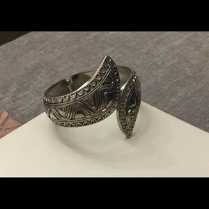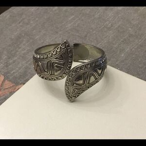 This pretty bangle bracelet is done in an etched tribal design and wraps around the wrist in an east west pattern. Done in a heavy sterling silver plate finish, it measures 2.25” in width at its widest point. It has a hinge style open/closure and will comfortably fit a 7” to 7.5” wrist size.
