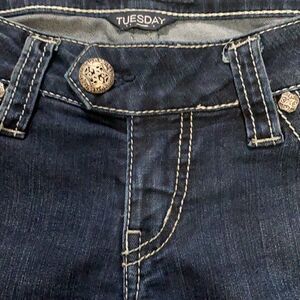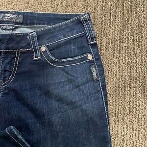 Silver Tuesday Flare Jeans dark wash size 29 in great condition. Waist approximately 15” flat and inseam length approximately 27.5”. These jeans length were tailored professionally so you can’t tell.