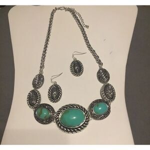 This beautiful necklace and earring set looks oh so expensive! A center horizontally set oval simulated turquoise has a rope accent frame and has two smaller stones on each side. The smaller stones have a gorgeous filigree design. Two more ovals have a Filigree center and rope design frame. They all hang on an 18” rope chain necklace that has a 3” extender and lobster claw clasp closure. The matching dangle style earrings are 2” in length and have ear wire hook closures. Both the necklace and earrings are done in a heavy sterling silver plate and then layered in rhodium for a lifetime of sparkling and durable wear. We also have this set in simulated black onyx in our other listings.