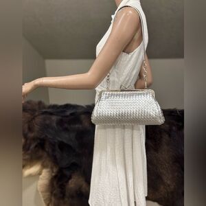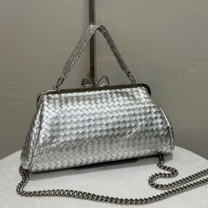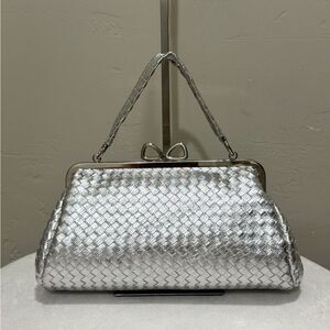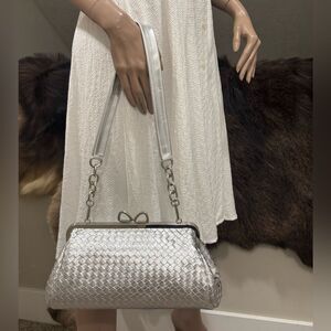 Silver Woven Leather Handmade Unique Bow Shaped Kisslock Baguette Bag/Crossbody