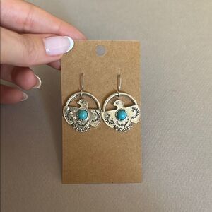 Elegant silver earrings featuring a stunning turquoise accent. Perfect for adding a touch of color to any outfit.