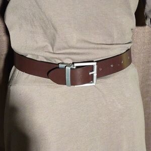 This brown faux leather belt has a pewter color buckle and measures 29.5" long and 1.5" wide. Pre-owned and in good condition. All offers welcome.