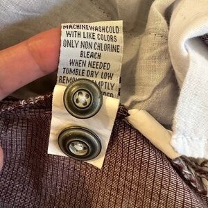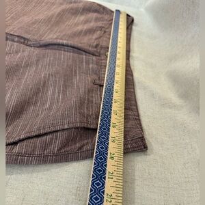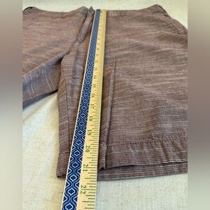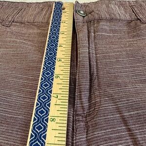 Burgundy and white patterned shorts with a zipper fly and button closure. Features front side pockets and back slip pockets.