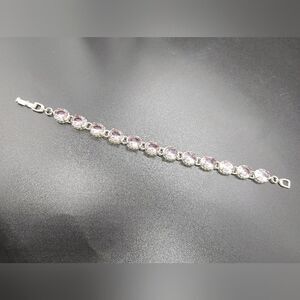 Sparkly silver tone bracelet with faceted prong set purple stones. Fold over clasp.