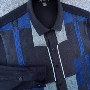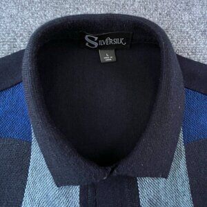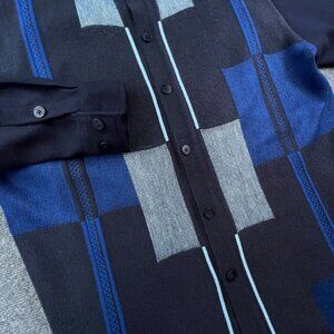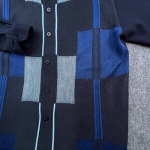 Silversilk Men's Large Button Up Knit Sweater Blue Geometric Rayon Blend