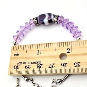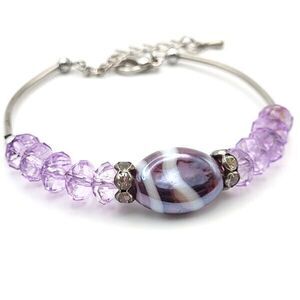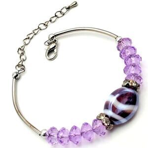 Experience the elegance of our silvertone adjustable bracelet, accented with captivating amethyst-colored glass rondelles. The centerpiece boasts a unique art glass design that exudes a vibrant purple hue, harmoniously blending with the beads. The lobster clasp closure ensures a secure fit, while the round shape and beaded style offer a comfortable, flexible wear. Unbranded and imbued with a artistic spirit, this bracelet is a versatile accessory that complements any outfit. The combination of glass main stones and secondary stones creates an alluring visual appeal, making it a standout piece for both day and evening wear. Indulge in the blend of artistry and style that this piece has to offer.