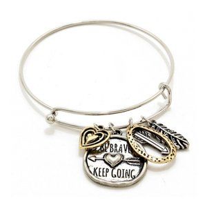 Silvertone Be Brave Keep Going Charm Metal Wire Bangle Bracelet