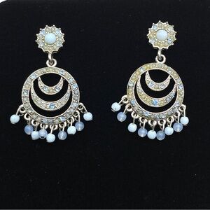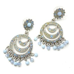 Silvertone Blue Beads With Square Pendant Necklace & Dangle Earrings Set. Pendant is on silver tone chain which measures 18.5" + 3" extender chain. Earrings are post-style with drop and dangle. Very sparkly and measures approx 2" from top to bottom. #7