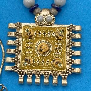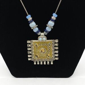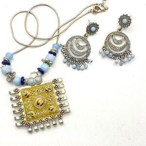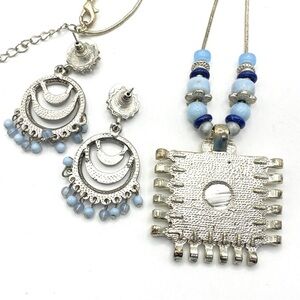 Silvertone Blue Beads With Square Pendant Necklace & Dangle Earrings Set