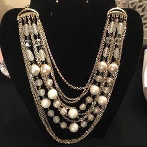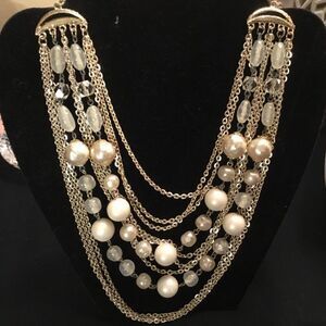 Silvertone Chains with White Beads and Faux Pearls Necklace