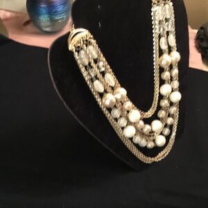 This beautiful necklace is adjustable from 16” to 19”. It features 9 silvetone metal chains along with two ropes of faux white pearls, white and clear acrylic beads. This can go from work to evening wear and is the perfect piece for a solid color dress. $12 each or bundle 3 of same price for $25 and save.