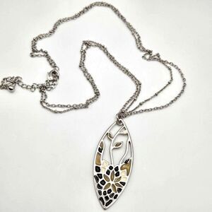 The Silvertone Double Chain Necklace with an Openwork Floral Pendant features a charm pendant in an oval shape, showcasing a resin mosaic style inlay. The necklace has a lobster closure and a 18-inch cable chain. The pendant captures a nature theme with floral and plant motifs, making it a stylish and whimsical accessory for any outfit. This unique piece is perfect for those who appreciate nature-inspired jewelry designs with a modern twist.
