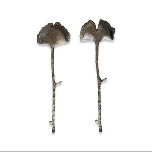 This serving set of two is designed to resemble Ginko biloba and is a classy way to serve your favorite leafy dishes. Silvertone and in perfect condition - the serving piece measures about 13 inches tall and the 4 inches wide at the widest part of the serving set.