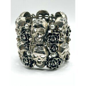 Silver-tone Gothic Skulls And Roses Wide Cuff Bracelet Rhinestones Faux Pearls