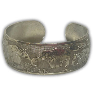 Silvertone Metal Cuff Bracelet Engraved Elephants 3" Dia Boho Artisan Style