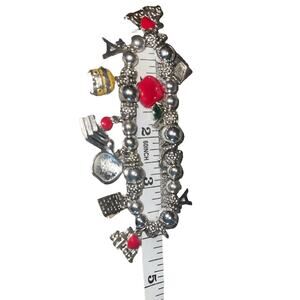 This charming bracelet features a delightful combination of enamel and silvertone metal, with a playful red apple and yellow bus charm. This bracelet has a slight stretch design ensures a comfortable fit. Perfect for those who love vintage and antique jewelry, this bracelet would make a lovely addition to any fashion jewelry collection. The metal purity and country/region of manufacture are unknown, but the quality of craftsmanship is evident in the intricate details of the charms. Don't miss out on this unique accessory!