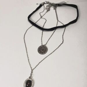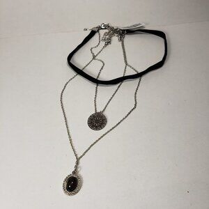 Silver-tone Set of 3 Black Velvet Choker Necklaces w/ Stone & Filigree Pendant