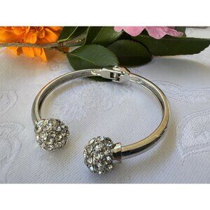 This pretty bracelet is in silvertone with rhinestone/crystal accent balls at the ends. Snap on style. Man Made materials. Really pretty on. From a smoke free home. Thanks for shopping with me.