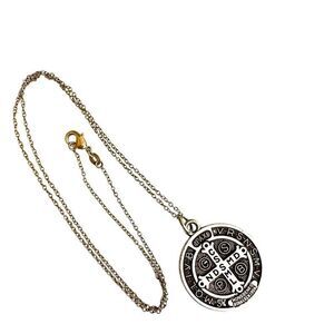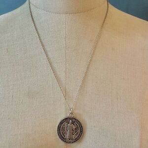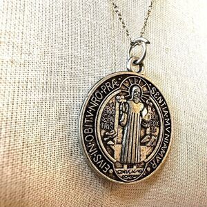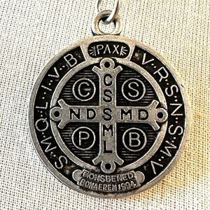 This round medal honors St. Benedict. He is the founder of Western Monasticism and the patron of monks, religious orders, coppersmiths, civil engineers, and those suffering from temptations.