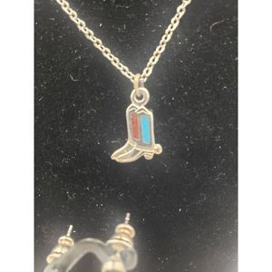 Silver-tone, Turquoise and Red Cowboy Boot Necklace and Earrings Set - 16" inche