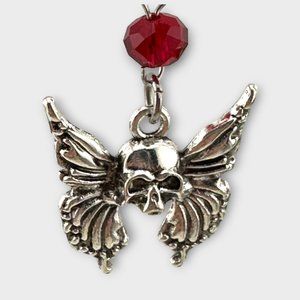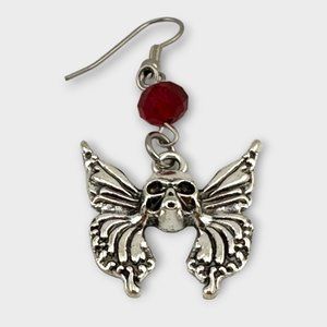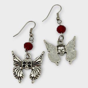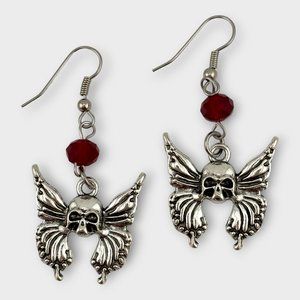 HANDCRAFTED -- Silver-tone winged skulls with red crystal accent drop dangle from surgical steel French Hook ear wires for pierced ear lobes. These are about 2 1/4" tall and 1" wide. Lightweight weighing 4.013. Each is topped with a red crystal measuring 5mmx7mm. Brand new, never worn. Excellent condition.