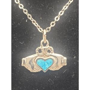 This childrens' jewelry set is silver-tone and Turquoise necklace and earrings. Brand New, never worn. Necklace is 16" long. Design is "Praying Hands".