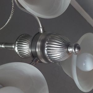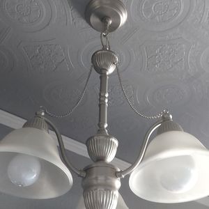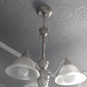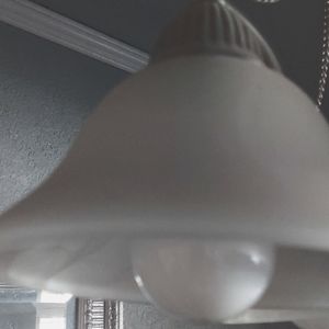 Very pretty white marbalize shades. Great condition. 3 lights. Had it for 2 year's so very great excellent condition.