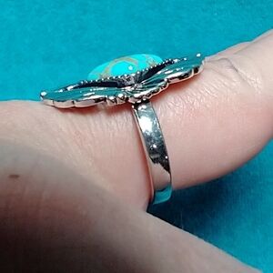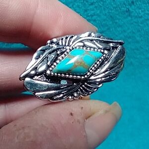 Silvertone leaf faux turquoise ring large intricate decorative jewelry blue gold