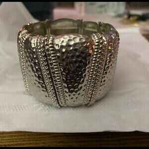 Very nice silver tone metal stretch bracelet! Could easily be casual or dressed up so a very versatile addition to your collection!! It is 1 1/2” tall
