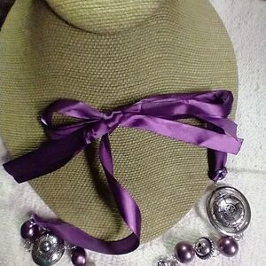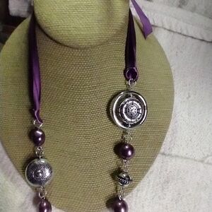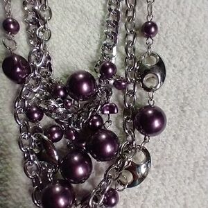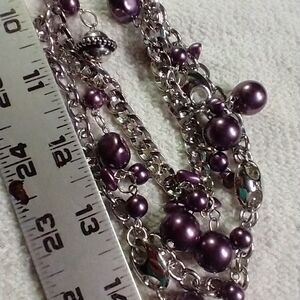 Silvertone purple ribbon purple beaded multi layer necklace